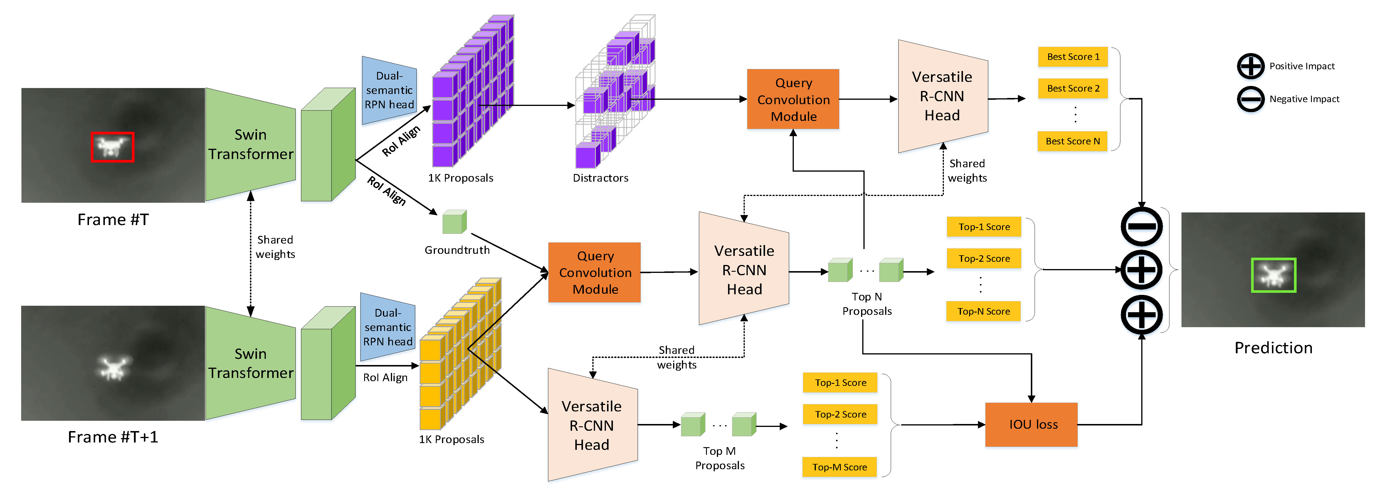 针对实际环境中红外无人机目标尺度和属性差异显著的问题,许廷发教授团队提出并构建了首个大规模红外无人机目标跟踪数据集,Anti-UAV410。该数据集包含410个红外视频序列和超过40万个无人机目标标注框。同时,团队提出了一种适用于复杂场景下的红外小目标智能定位与跟踪方法——SiamDT。该方法能够有效抑制红外图像中的复杂背景干扰,实现对弱小目标的准确定位与跟踪,方法框架如图1所示。