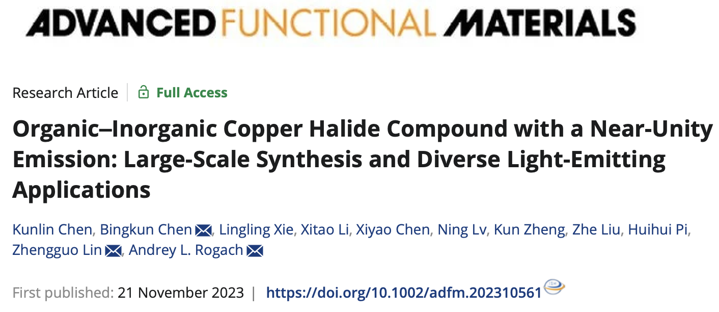Chen K. L., Chen B. K., Xie L. L., Li X. T., Chen X. Y., Lv N., Zheng K., Liu Z., Pi H. H., Lin Z. G., Rogach A. L., Organic–Inorganic Copper Halide Compound with a Near-Unity Emission: Large-Scale Synthesis and Diverse Light-Emitting Applications. Adv. Funct. Mater. 2023, 2310561.