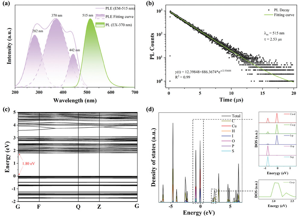 (TPP)2Cu4I6·2DMSO发光性能优异,其拥有横跨200-500 nm的超宽激发光谱,并且在紫外光激发下展现峰值位于515 nm的绿色宽带发射光谱,约78 nm的半峰宽以及85 nm的大斯托克斯位移,其荧光量子产率高达99.5%,是已有报道中最高效率的绿色发光材料之一。此外,其荧光寿命为2.53 s。将这些光学性质与理论计算的结果相结合,该团队猜测其发光行为与[Cu4I6]2-多面体及STE(自限域激子)有关。