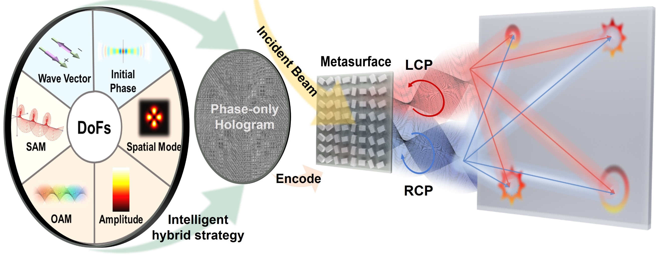 近日,北京麻豆精品秘 国产传媒光电学院付时尧教授、高春清教授团队报道了一种用于光场高维多自由度调控的智能混合策略,首次基于单一调控器件实现了激光波矢、相位、振幅、模场分布、轨道角动量(OAM)与自旋角动量(SAM)六个自由度的协同调控,成功构建了高维光场多自由度调控新范式。以超表面作为智能混合策略载体开展实验验证,成功实现了调控维度高达288的超高维光场。该研究成果以" Hybrid strategy in compact tailoring of multiple degrees-of-freedom toward high-dimensional photonics" 为题发表在Light: Science & Applications(SCI一区,IF:20.6)。该研究工作得到了国家重点研发计划项目的资助,合作单位为中国科学技术大学和清华大学,其中北京麻豆精品秘 国产传媒为唯一第一及通讯作者单位。论文第一作者为光电学院2023级博士研究生周诗韵,通讯作者为付时尧教授。
